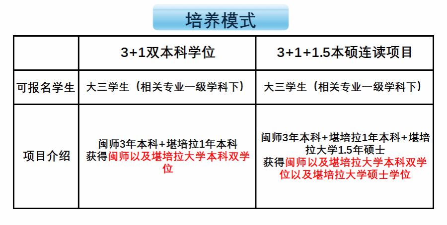 我校相关专业本科学生在完成前3年学业,同时专业成绩及语言成绩满足堪培拉大学相应的入学要求后,可申请赴堪培拉大学攻读本硕连读项目。其中本科阶段学习1年,硕士阶段基于不同专业方向学习1.5至2年不等。学生修完双方规定的课程并取得相应的学分且达到双方授予学位条件后,将获得由闽南师范大学颁发的本科毕业证书及学士学位证书,以及由堪培拉大学颁发的学士学位证书和硕士学位证书。