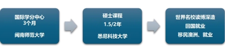 项目采用“0.5+1.5/2”学分互认模式。学生根据语言水平不同,在闽南师范大学修读3个月的国际学分课程,英语语言成绩和专业基础课满足标准后,前往悉尼科技大学继续完成剩余1.5年或2年的硕士课程,成绩合格者,可获得悉尼科技大学硕士学位。