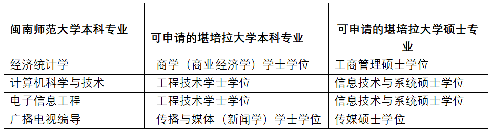 我校相关专业本科学生在完成前3年学业,同时专业成绩及语言成绩满足堪培拉大学相应的入学要求后,可申请赴堪培拉大学攻读3+1双学位暨本硕连读项目,其中本科阶段学习1年,硕士阶段基于不同专业方向学习1.5至2年不等。学生修完双方规定的课程并取得相应的学分且达到双方授予学位条件后,将获得由闽南师范大学颁发的本科毕业证书及学士学位证书,以及由堪培拉大学颁发的学士学位证书或硕士学位证书。